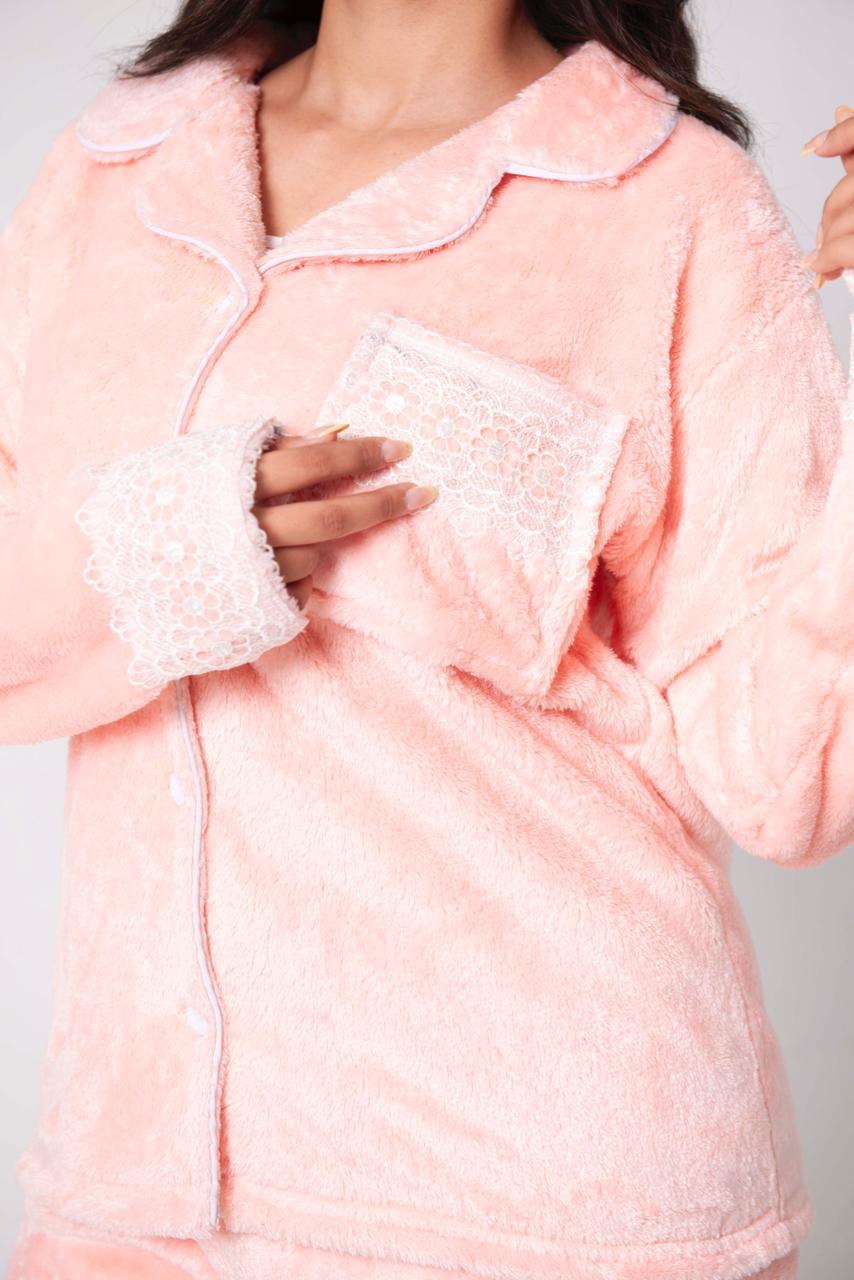 Wrap yourself in warm elegance with our Rose Furr Pajama, crafted from ultra-soft polar fur fabric. Its plush texture and gentle rose shade create the perfect blend of coziness and chic comfort—ideal for relaxing moments at home.